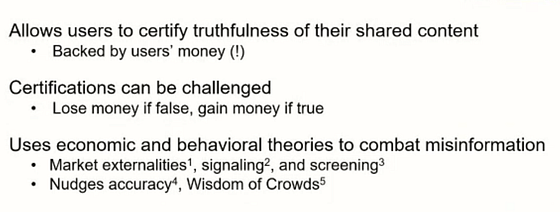 Nichols described the current social media environment as one where “likes” amplify information that is the most sensational — not the most accurate — and where deterrents have little effect. Further, he argued, decentralized, platform-level interventions don’t require a third-party arbiter empowering users toward truthfulness. The approach provides small financial incentives for sharing the truth, and penalties for those sharing misinformation. The goal: enhance the visibility and trustworthiness of accurate information.